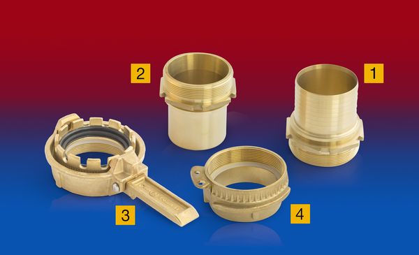 2) Hadicový adaptér s vnějším závitem, hladká průchodka s bezpečnostním límcem pro uchycení upínací svorky; vhodný pro CONNECT 231 SAFETY CLAMP ASSEMBLY
